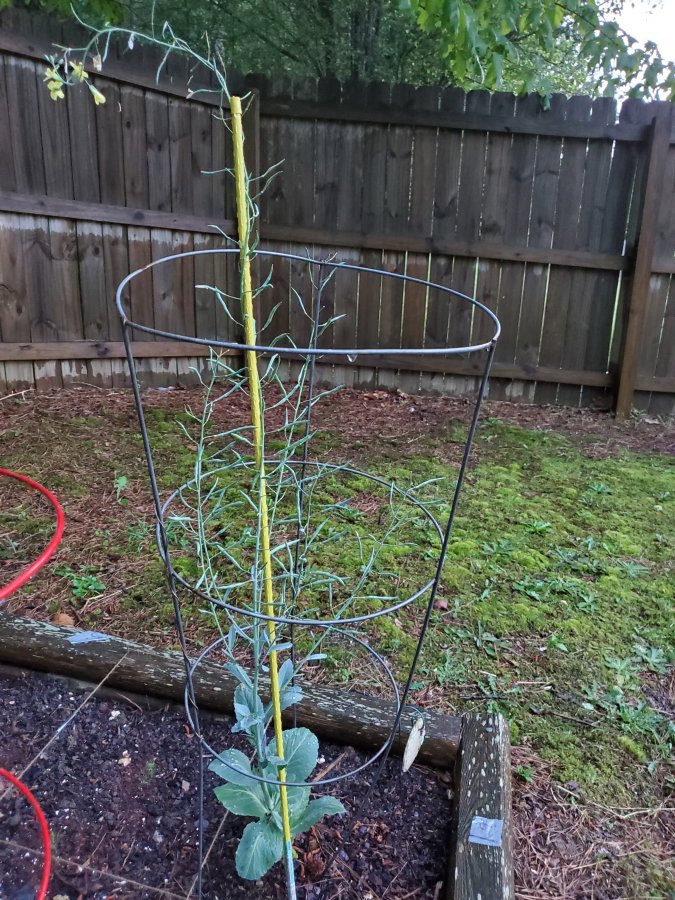 My daughter and I are trying our hand at gardening. This grew out of our compost pile. First we thought it was cabbage, then brussell sprouts. Now it has grown 5′ tall with yellow flowers that have changed to seed pods or beans. What is it?