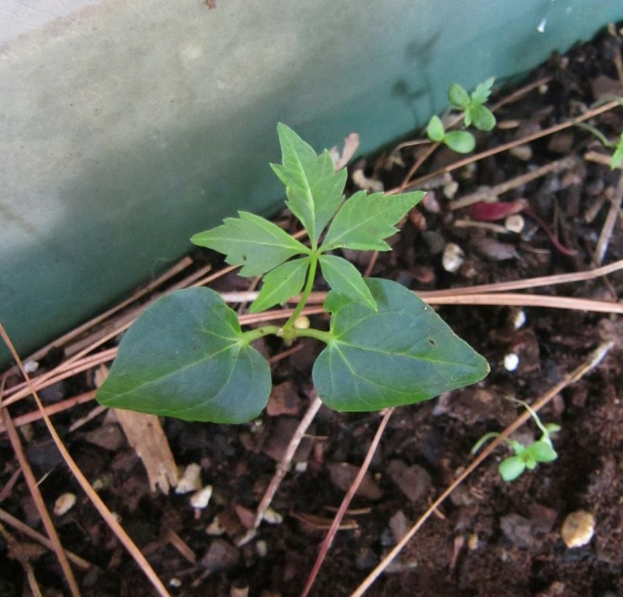 Unknown plant with two different types of leaves. Voluntary started growing in planter box.