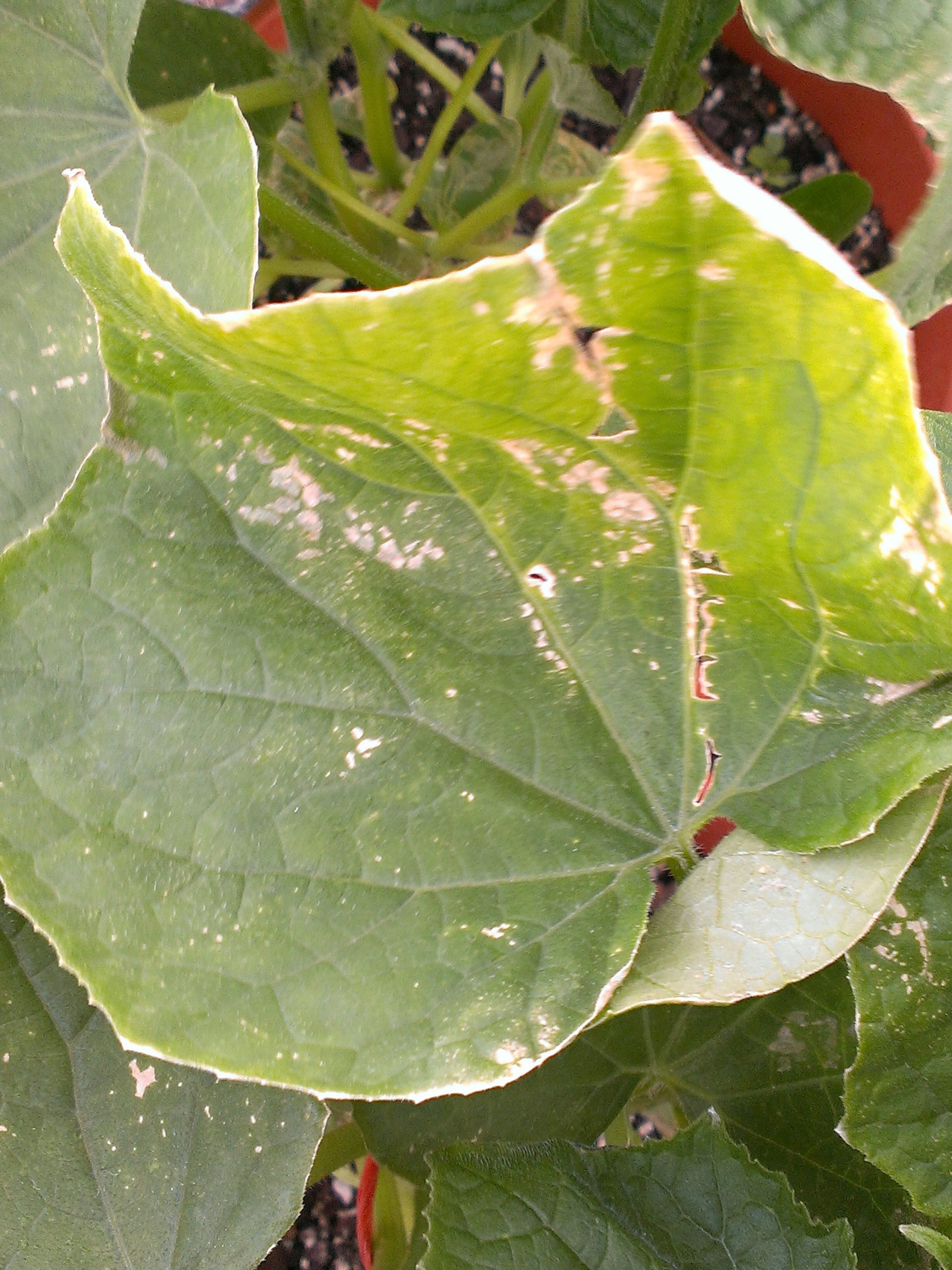 My cucumber plants have these dry spots on the leaves, does any one know what it is and what I can do to solve this problem?