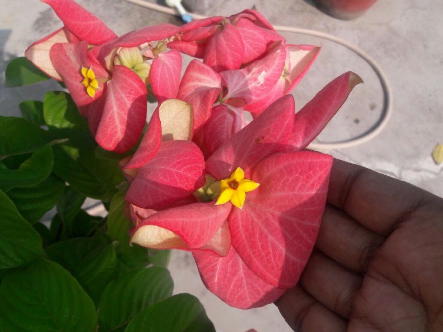 Looks like some thing in the Mussaenda genus. This might be a cultivar named Mussaenda philippica ‘Dona Luz’? Best wishes! https://www.google.com/search?q=Mussaenda+philippica+Dona+Luz&tbm=isch&tbo=u&source=univ&sa=X&ved=0ahUKEwiOjYbDlcnPAhUEWj4KHWOMBz0Q7AkIOQ&biw=1920&bih=909#imgrc=_