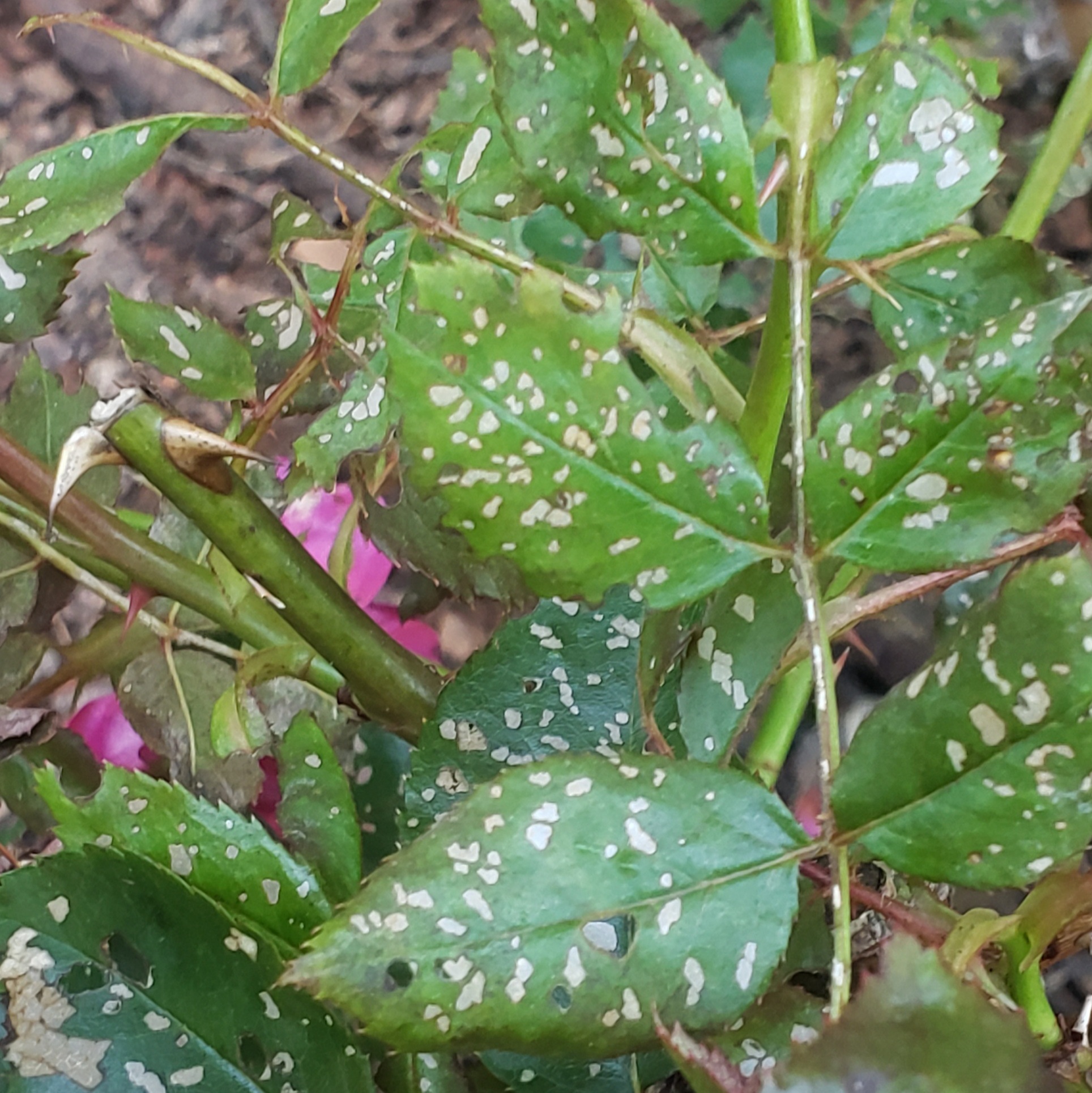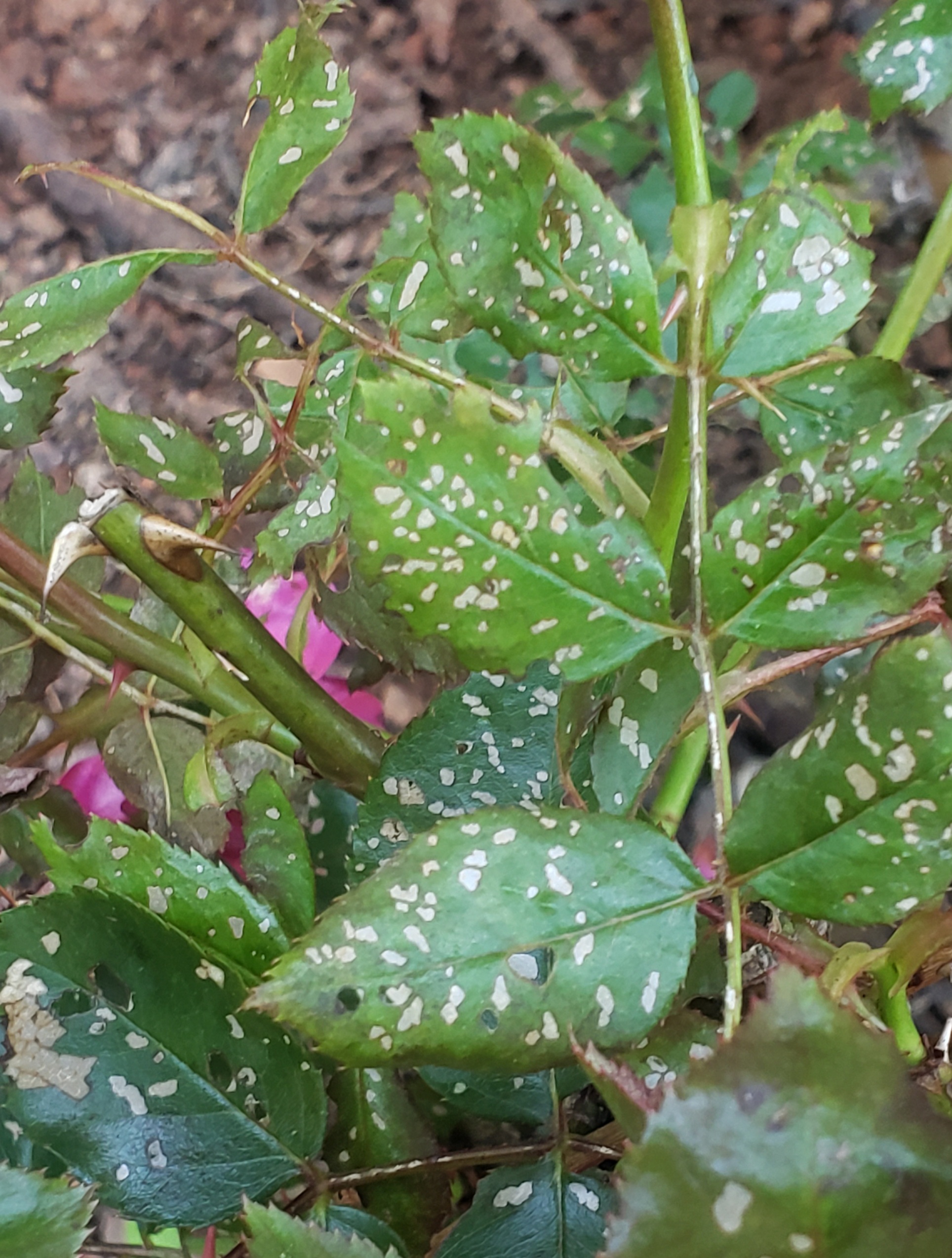 My double knockout roses are in trouble. I think one has powdery mildew and caterpillar damage and one of the others is starting with the leaf damage. Should the one that is in such bad shape be dug up? I have been treating them weekly with Neem oil solution.