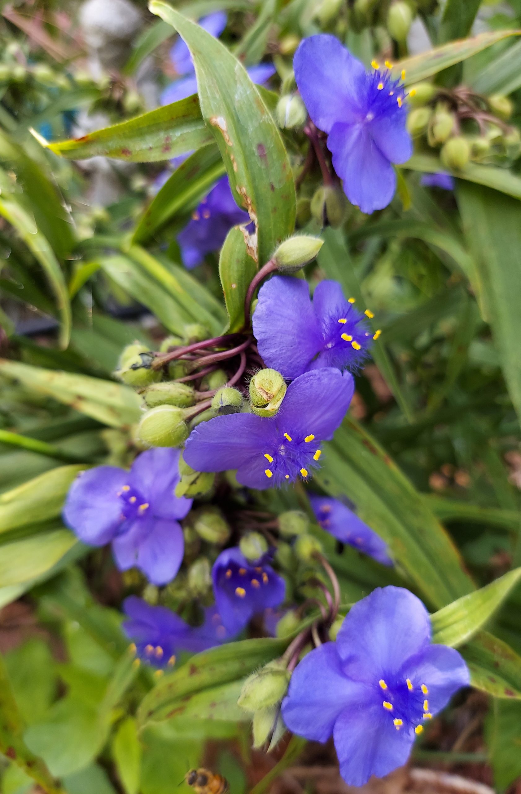Maybe a type of spiderwort (Tradescantia), possible the species T. virginiana? Regrettably I can’t tell “what is wrong with it?” I’m wondering perhaps some type of leaf-spotting fungus? Copy & paste the included link below for more information of T. virginiana. Best wishes!