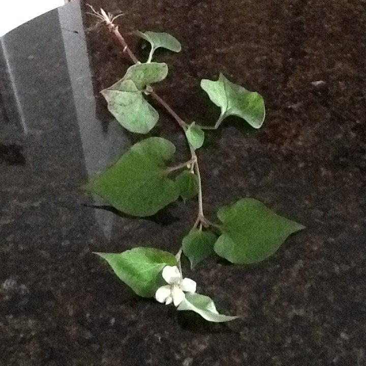 4 petal white flower protruding yellow center purple green heart shaped leaves. Very stinky Growing on the North side of house. Grows straight up on individual stem.