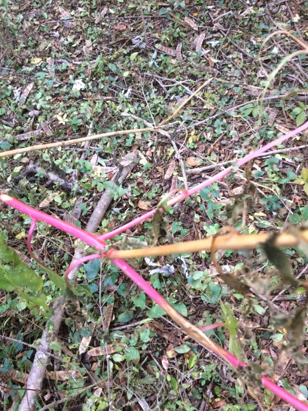 It is stick-like/rigid growing in the ground at about a 30-degree angle. Magenta in color until the very tip it becomes tan/brown. Virtually no leaves left on it. About 7 feet long. It is solo, the only one in the yard.