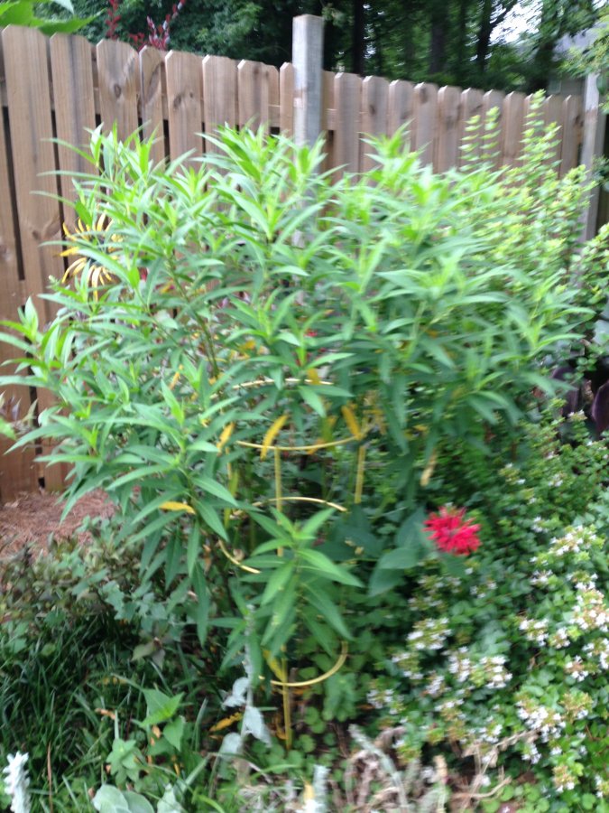 This plant grew last year in between my red bee blossom. Not sure what it is but it does die back in Winter and came back happily It is about 3.5 ft tall. It does not bloom. This is its 3rd year.