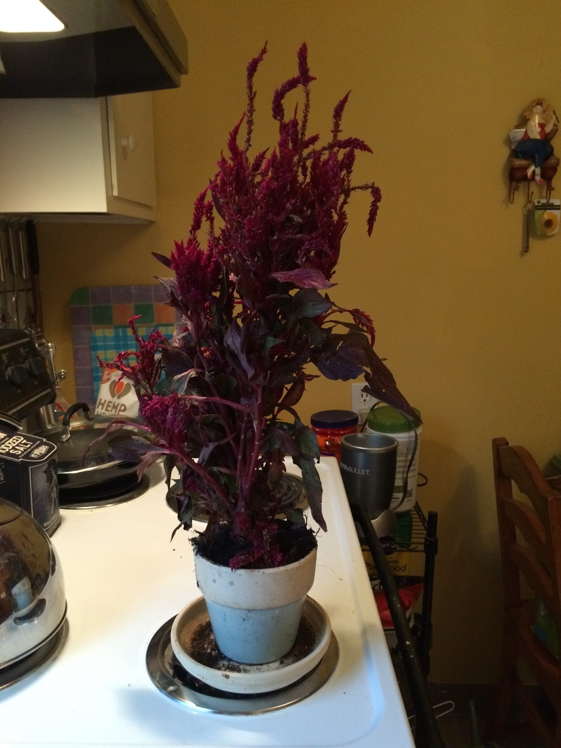 Someone dropped this plant – it has excellent footballs so I took it home and planted it in a pot but I have no idea what it is. The leaves are dark green and maroon, the flowers are vertical and a deep maroon.