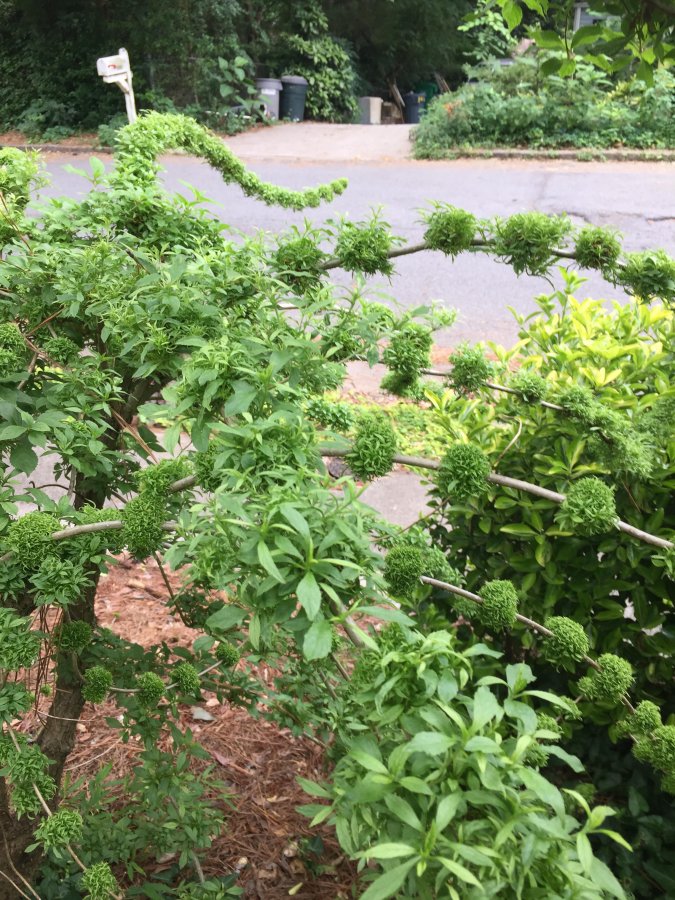 This is a picture of a hydrangea plant in our yard. It didn’t grow correctly this summer and has small growths and now several other plants in my yard are doing the same thing, including the rose bush that didn’t grow any leaves this summer. I’m unable to find anything about it online.