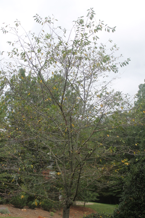 Have assumed this is a cherry tree, but now not so sure. The disease or pest has attacked this tree for at least the last two years. By early August it looks like a skeleton. What is the tree and disease, and what can I do to prevent the destruction next year? After last summer I thought this tree had not made it, but it came out looking quite full and nice in April/May.