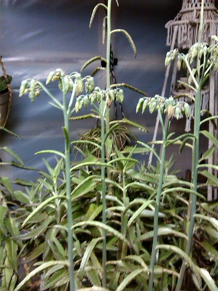 The picture is a little bit fuzzy on the leaves, but I’m thinking it looks like a Bryophyllum daigremontianum, also known as “Mother of Thousands” that will drop baby plants off the leaves and spread all over the place. The flowers are not much to talk about but the plant is interesting.