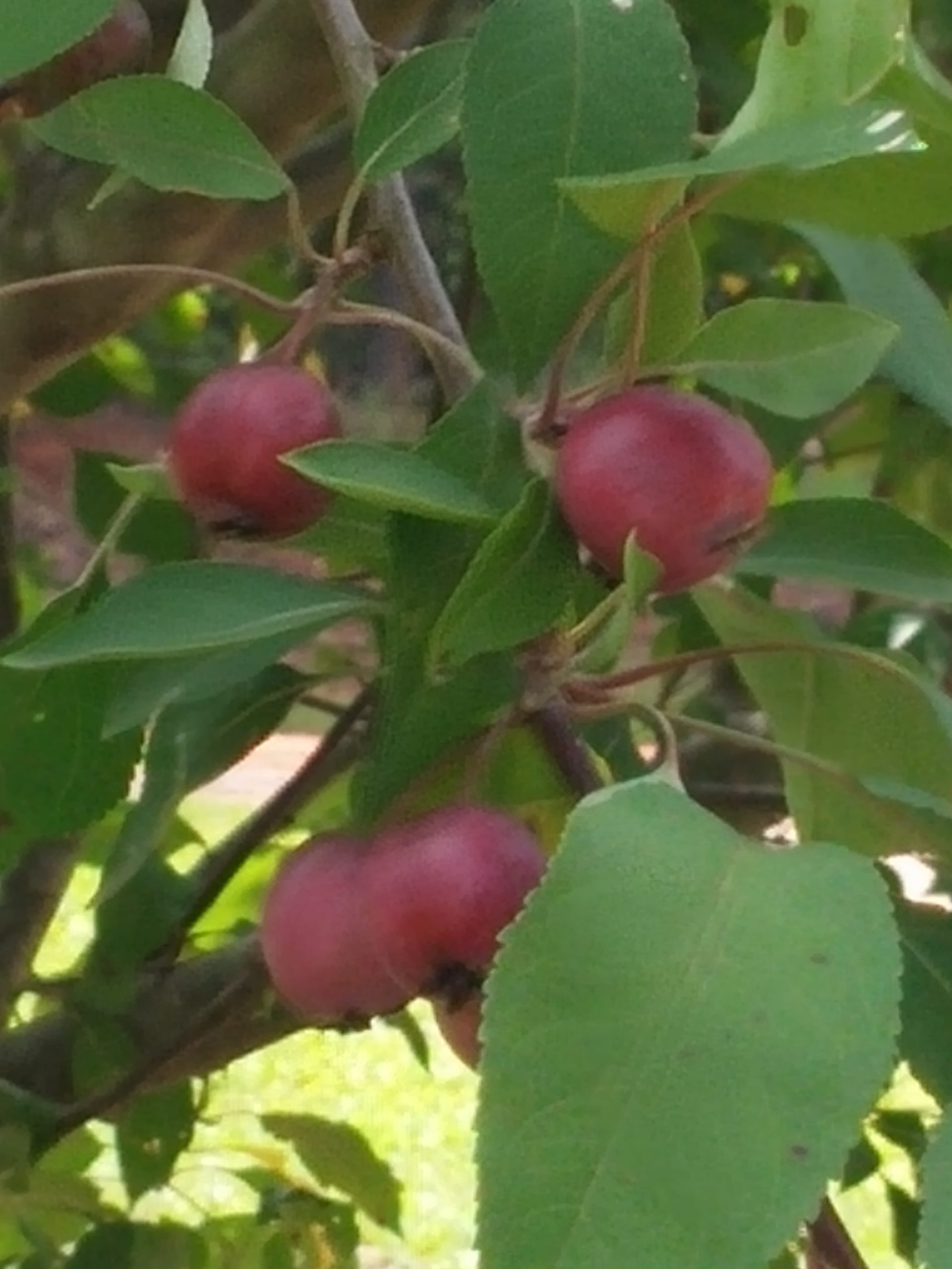 They look like service berries on a Service Berry tree, fruits about 1/3-1/2 in. in diameter on a small (8-15 ft. tree), ripening in late spring. If so, they are edible by humans and birds; lightly sweet and delicious. Keep well for about 1 week from picking in refrigerator.