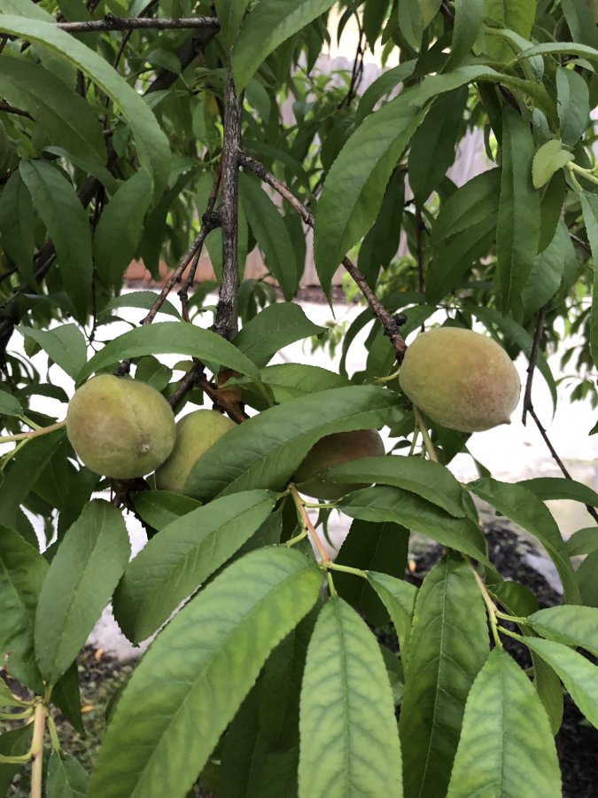Pink then white blossoms. Now fruits 2-3 inches. Has been shedding/thinning/ dropping fruits. Attracts lots of bumble bees