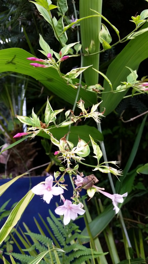 Evergreen climber variegated leaves clusters of small pink flowers May and June