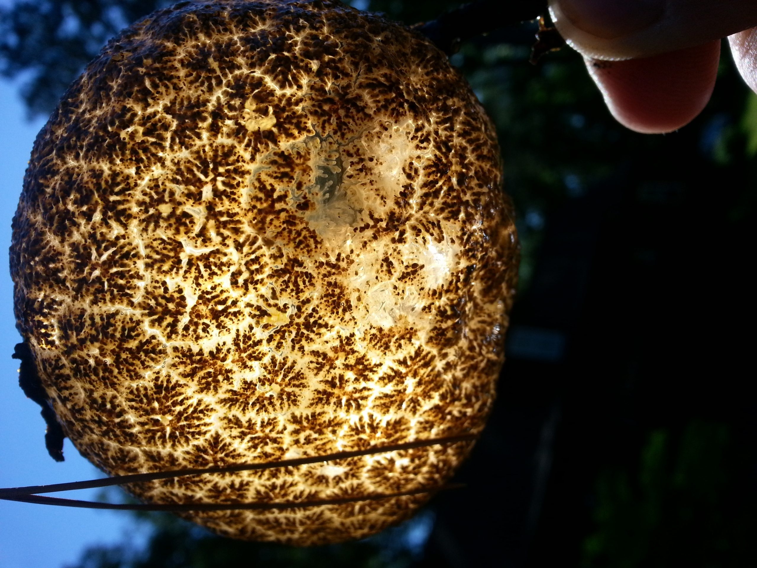 While fishing at Lake Sinclair this Memorial Day weekend, my line hung on a branch (think it was from pine tree) and I discovered this fascinating blob formed around one of the twigs on the branch. It is slightly smaller than a softball and slightly less firm than an apple, it is not gelatinous, but obviously high water content. The one picture is taken with the sun behind the object so you can see the organized detail. I did throw it back in the lake by the way…