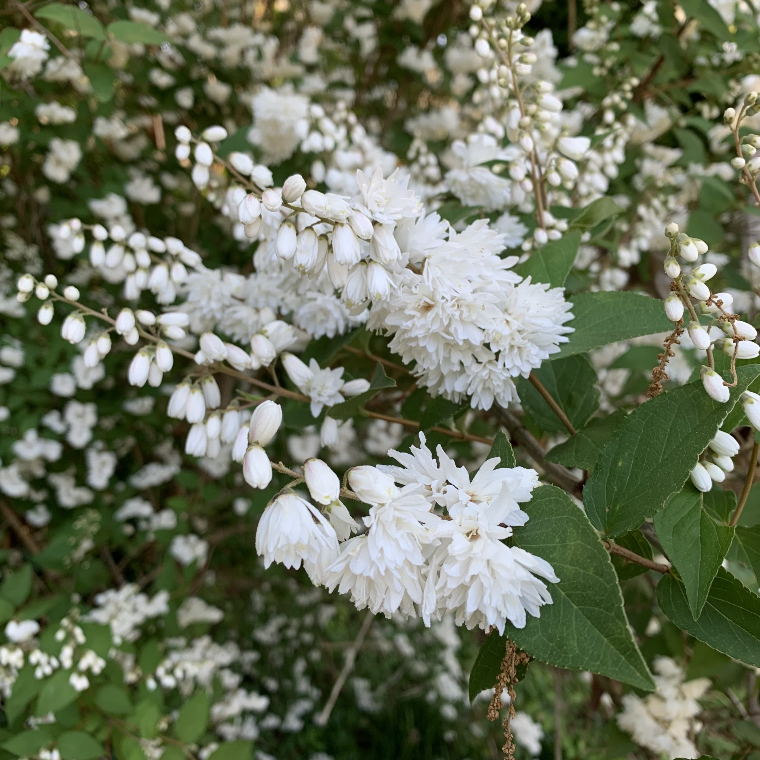 Cascading white fragrant blossoms; many one to two inch diameter stems coming from a two foot diameter base; grows in shade; eight to ten feet tall