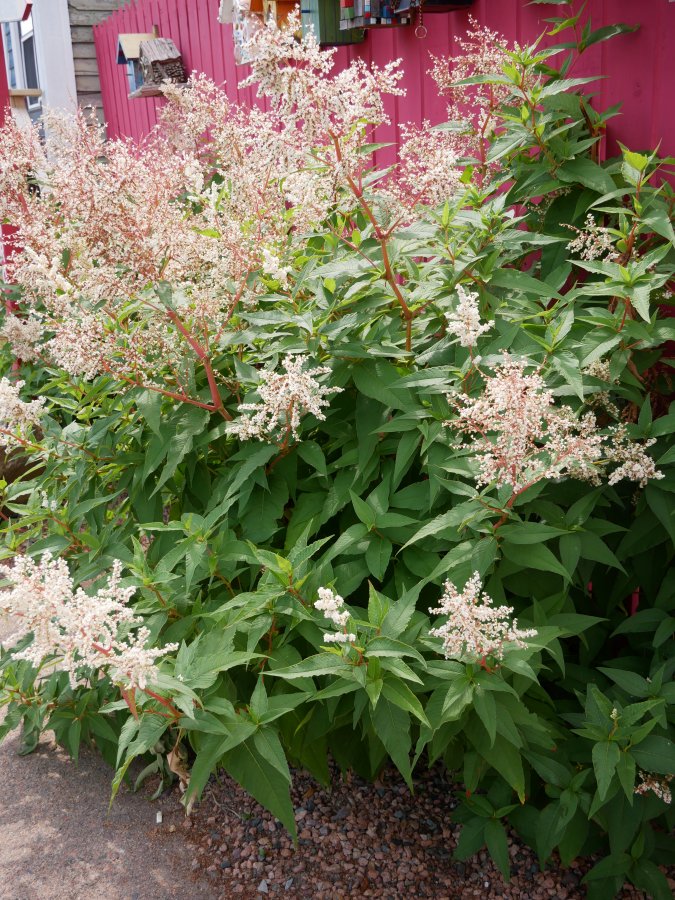 It looks very similar to the giant fleece flower except the pictures I am seeing on line donÕt have the striking red stems. Reminds me of Japanese knotweed which I have seen growing around here (North Carolina Mountains) with red stems but the pictures online only show green stems. Curious.