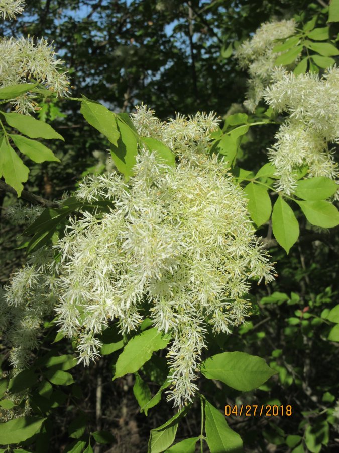 This shrub has cream colored, drooping flowers similar to a chestnut, but more delicate. The leaves are more like that of an elderberry bush.