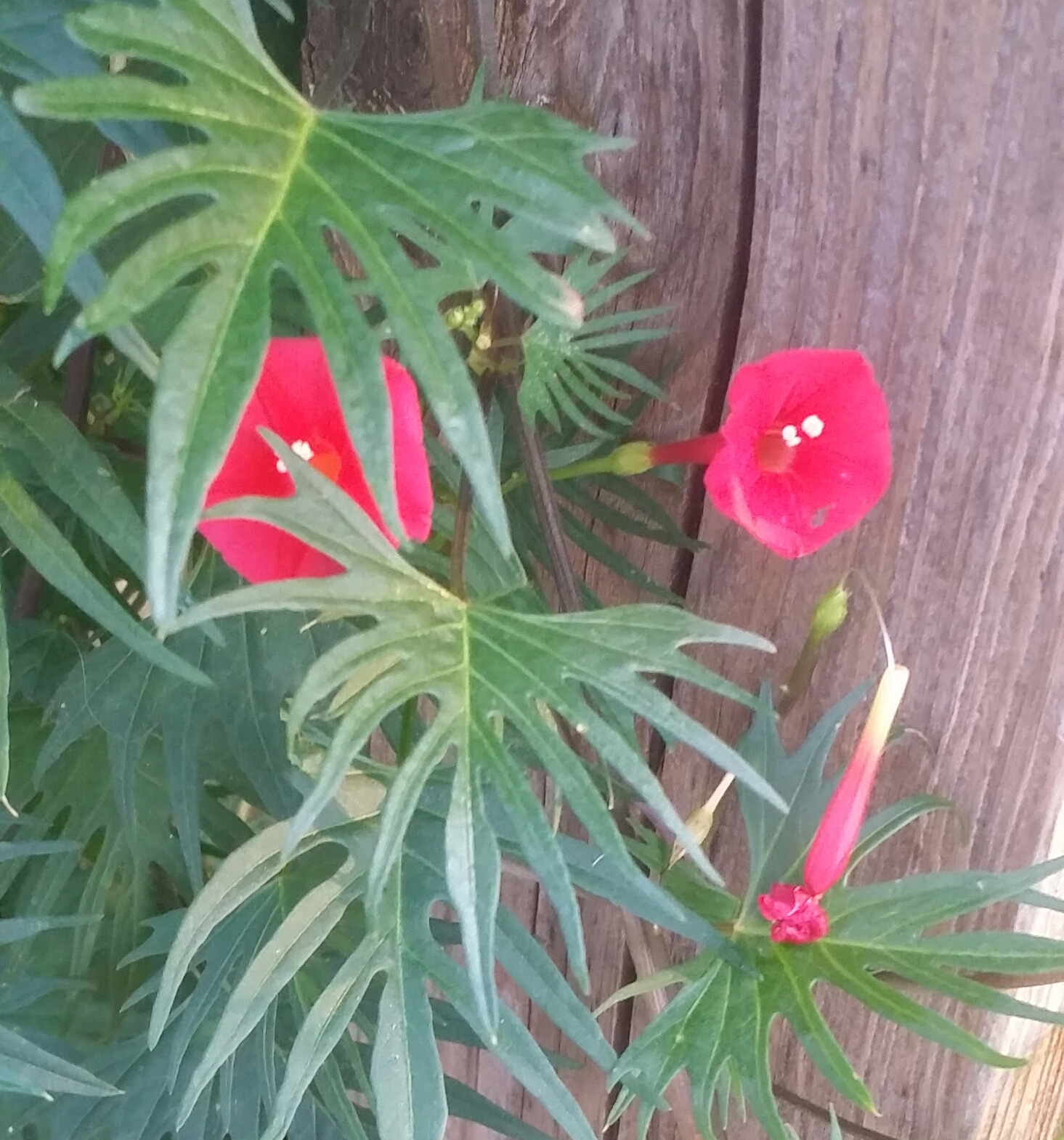 Yes Witchazel thank you. That has the palm like foliage but the name is still confusing me. Cypress vine as I’ve known it has lacy leaves. The botanical name for the lacy leaf variety is ipomoea quamoclit. This one is possibly Ipomoea X multifida a hybrid of garden origin between cypress-vine and the related scarlet morning-glory (Ipomoea coccinea): http://loghouseplants.com/plants/shop/ipomoea-x-multifida-cardinalis/ Seeds are available: Google CARDINAL CLIMBER SEEDS