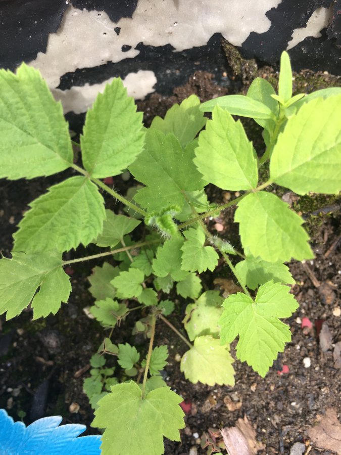 Growing randomly in flower pot on sunny front porch in Orange County NY. Noticed it at the beginning of May 2019. It has tiny hairs/thorns along the stem but not on the leaves.