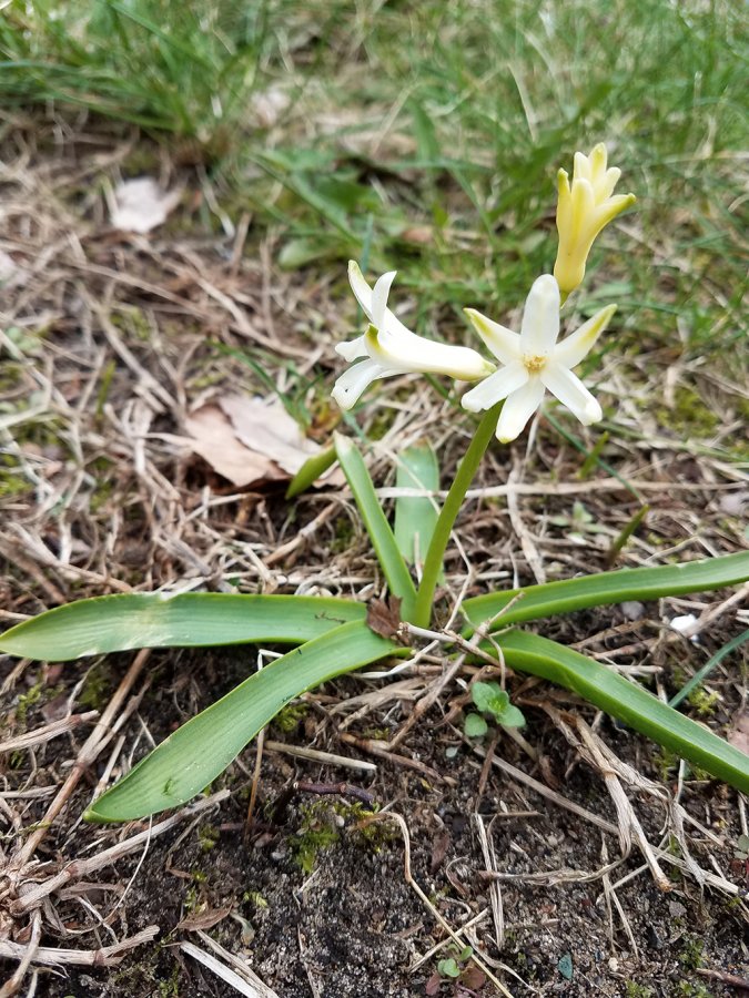I can’t find this white flower after searching through the net. I just moved in not long ago, so this could be a non-indigenous plant left behind. Flower primary color is white with gradient of yellow from the base. Extremely fragrant like Daffodil or Lilac. My guess is young common Hyacinth Carnegie still growing into full blossom. However the drooping basal leafs and lack of flowers atop leave me unsure..