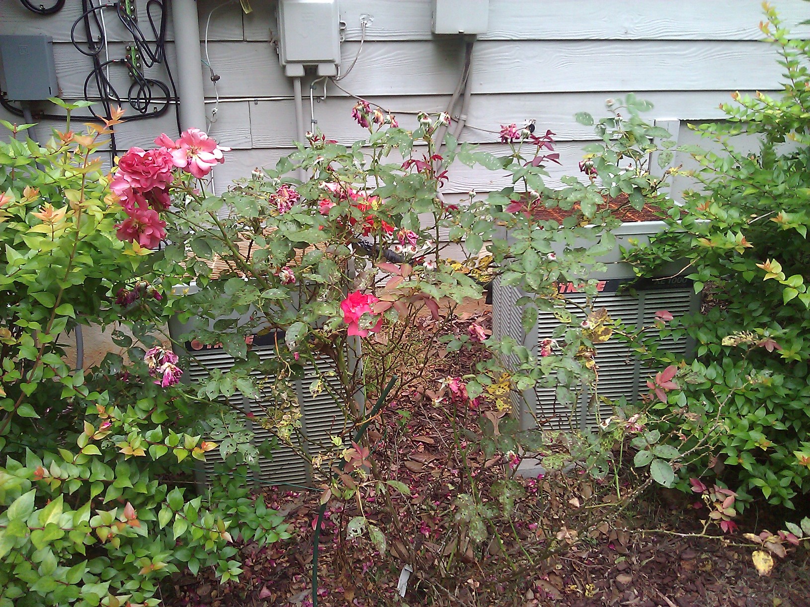 Looks like a leaf spot fungus. I doubt that you can save it… 1) there’s too much other stuff there, and no air flow… 2) after all that rain, there’s a lot of fungus on everything. 3) I don’t think there’s enough light there for a rose. You could try cutting it to the ground and getting rid of the shrubs on both sides… Or just pick a new spot to move it to.