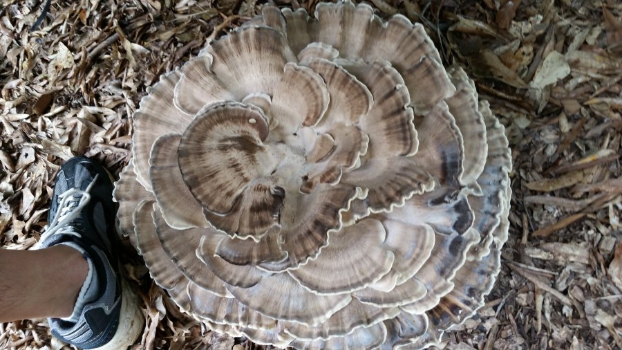 I took that picture a few days ago and the mushroom seems to have gotten even bigger. Perhaps greater than 2′ diameter now. Also, last night I snuck up on it with a flashlight. It was releasing so many spores it created a small fog surounding it.