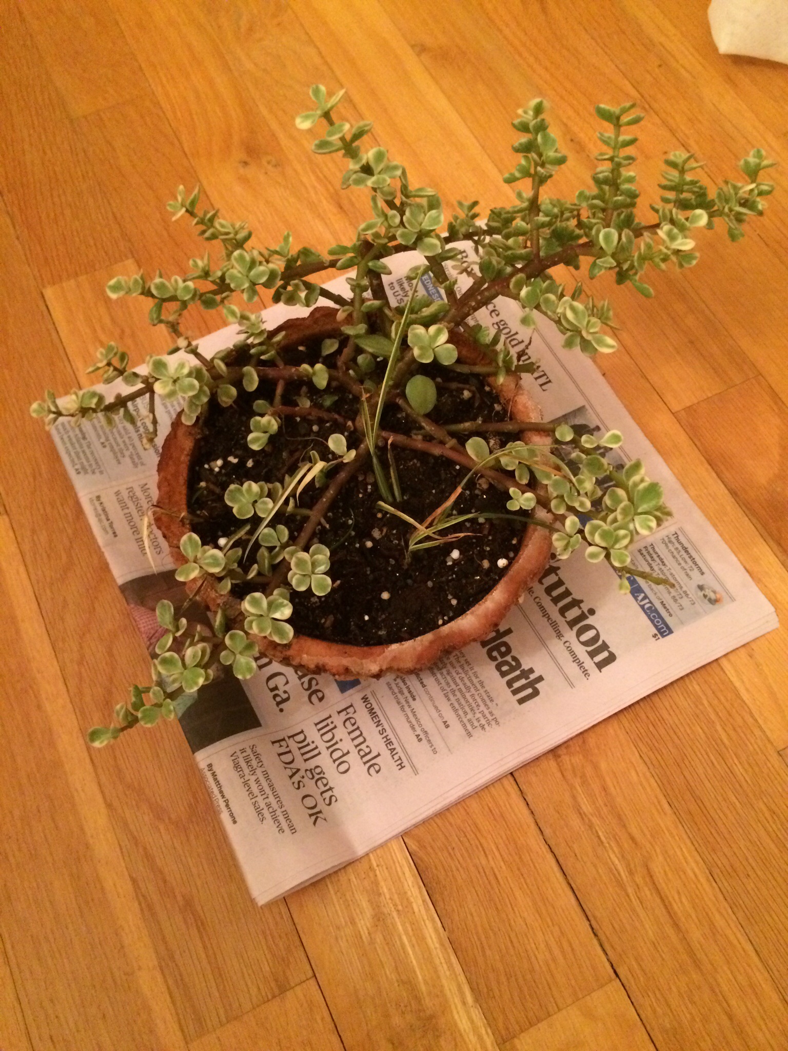 This might be Variegated Elephant bush, Rainbow bush (Portulacaria afra ‘Variegata’). It is a succulent. You should transplant to another pot comes with a drainage hole. Use a gritty, fast-draining soil, like a succulent mix. Sorry, I can’t tell what the grass-like plant is. Maybe you can try grow it a separate pot, you will learn more as it matures. If you don’t know by then, please post its photo here. Best wish!