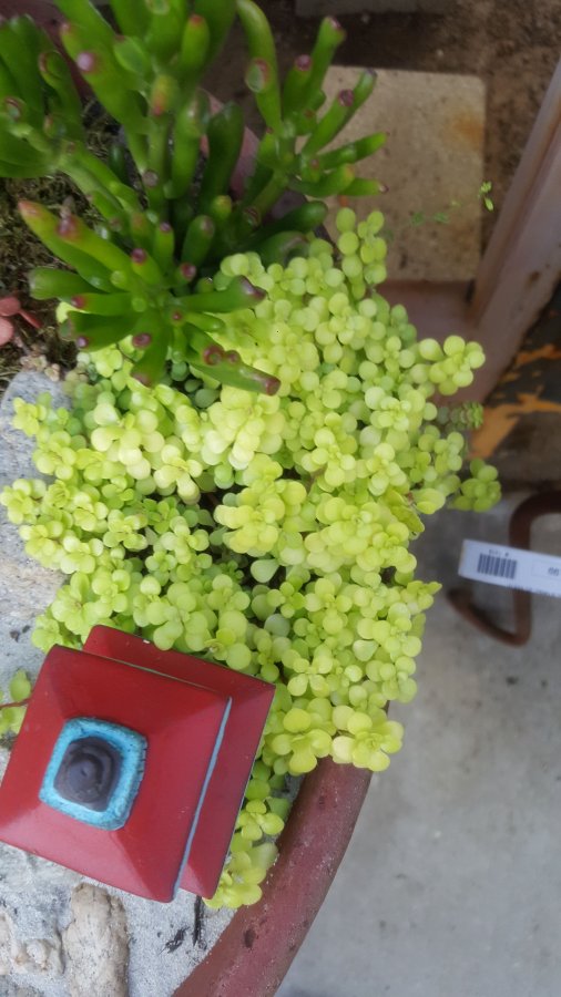 Maybe a cultivar of stonecrop in the Sedum mackinoi group. This could be either ‘Limelight’ or ‘Ogon’. Check out the link below and see if you have a match. Click on image to enlarge. Best wishes! http://www.missouribotanicalgarden.org/gardens-gardening/your-garden/plant-finder/plant-details/kc/b266]/sedum-makinoi-ogon.aspx