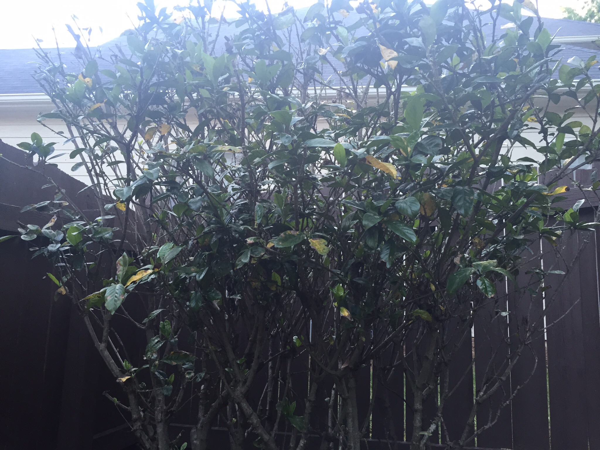 I think I’d give that baby a severe pruning… and see if that didn’t fix things. Gardenias appreciate being cut back, and opened up to let in air. Leaf fungus is usually not a an issue that requires treatment. I found this: http://www.clemson.edu/extension/hgic/pests/plant_pests/shrubs/hgic2058.html