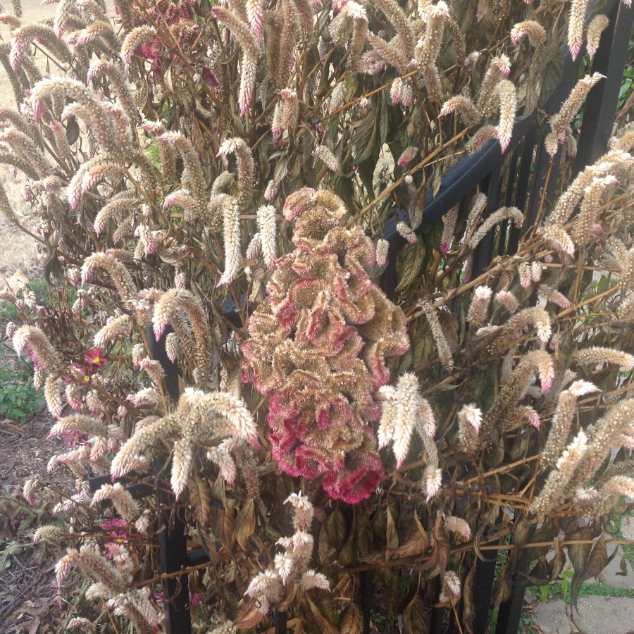 There are two different flowers forms of the Celosia genus in the photo. _ The one in the center with ridge crest form maybe a cultivar in the cockscomb (Celosia argentea var. cristata)? Check out the link below for more information. The other with the cylindrical flower form looks like the wheat celosia (C. spicata)? Best wishes! http://www.missouribotanicalgarden.org/PlantFinder/PlantFinderDetails.aspx?kempercode=b72