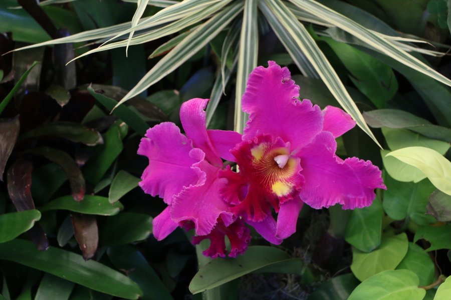 It’s an orchid plant, sorry, I’m an expert and guessing that this maybe a cultivar in the Cattleya group perhaps. Maybe you could join an orchid forum from the included link below for getting it exact ID. Best wishes! http://gardentoronto.ca/soos2010.html