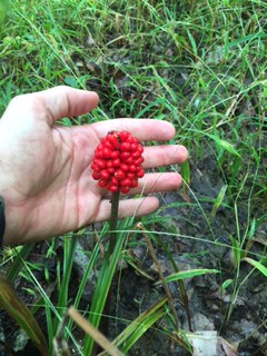 Yes, I agree, looks like to Jack-in-the-Pulpit berries/seeds that appear in late summer/fall. Throughout most of the season it has lovely large green leaves, but the leaves die back by fall and the berries appear vivid red like this.