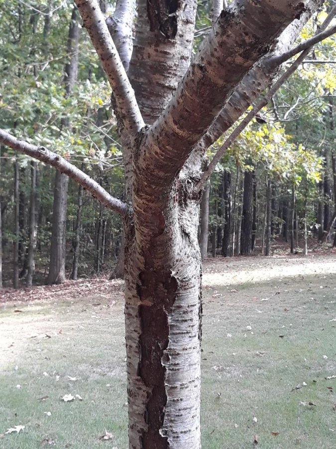We planted this tree for my daughter about 4 years ago – the tree was 10 at the time so it would be as old as she is (2 other trees planted to grow with her died). It has done well but I noticed these awful looking places on the trunk and now I’m very worried about the tree’s health. What can I do for it? Is it dying?