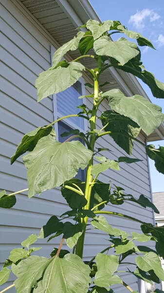 So me and my mom started a veggie garden in our back yard. And over a few months this has grown over 6ft, the stem is thick and rough. The leaves are rough as well and are heart shaped. I have looked around the plant and I do not see any flowers for blooming yet but I have seen new leaves begin to grow. We forgot what we planted and we worked on it at different times making it hard to identify can anyone help?