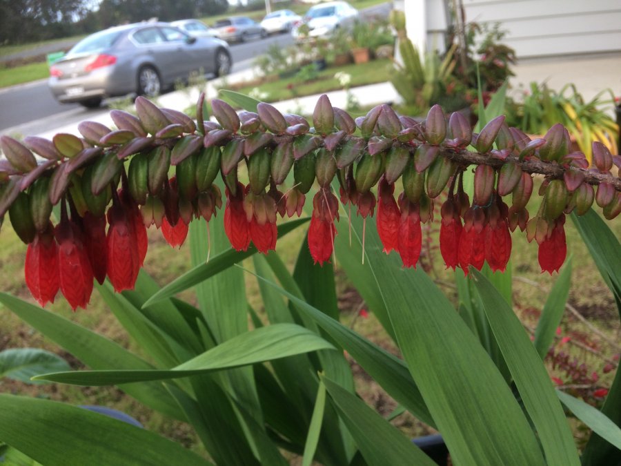I don’t think this is a plant native to NZ where I live. It is an evergreen shrub and leaves range from green to red. Flowers hang in a line all along the branches.