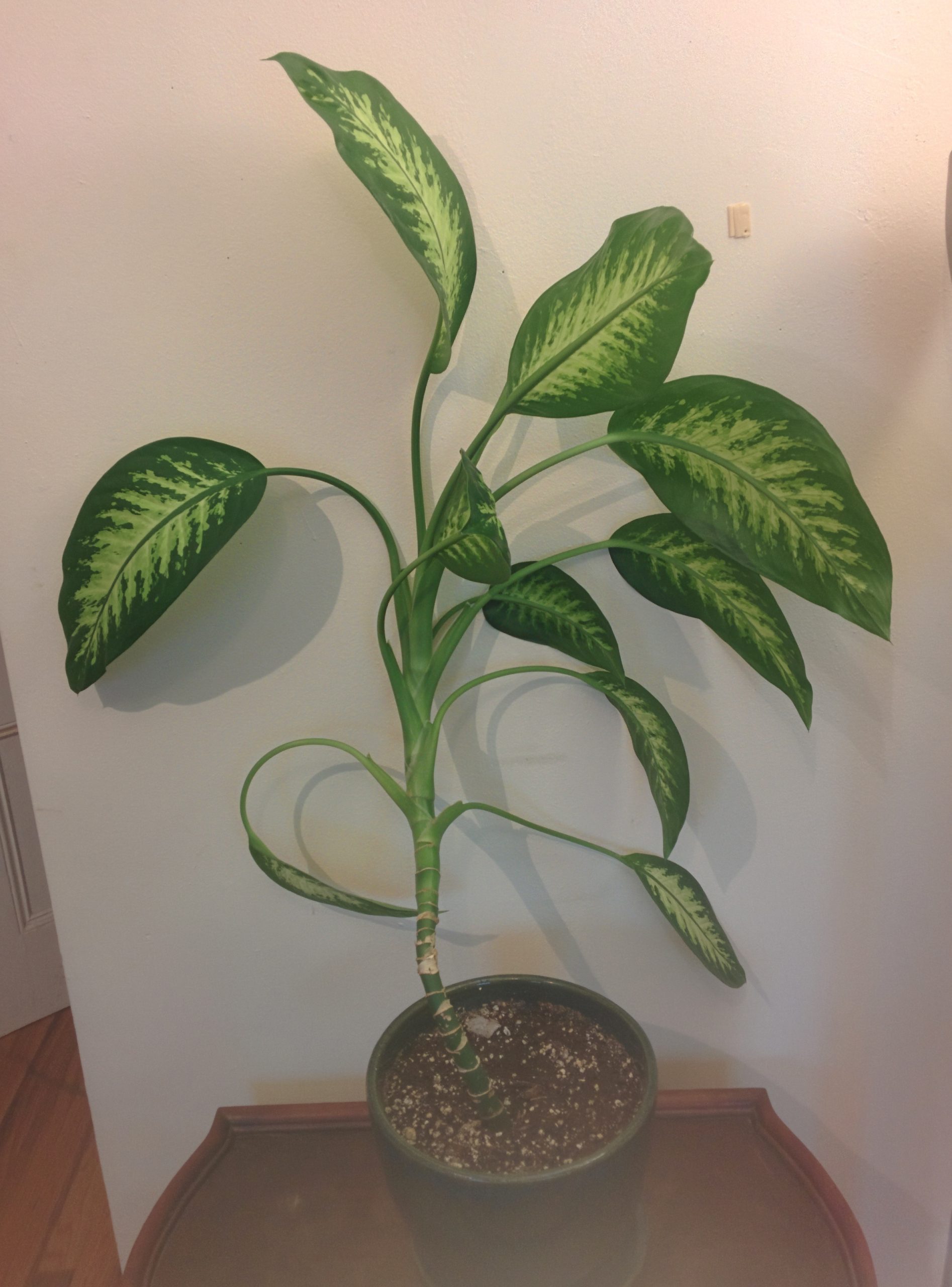 I agree, it is Dieffenbachia some times called dumb cane because it is slightly toxic and numbs vocal cords if ingested. Adventurous cat I once had would not leave my pant alone so I got rid of it per vetrinarian advice. Wish I had gotten rid of the cat instead but that is another story. Looks like your plant needs a little more sunlight and regular feeding with a water soluble fertilze for houseplants. Water only once a week,one cup of water, remove any water that collects in the tray. They are beautiful plants, good luck with yours.