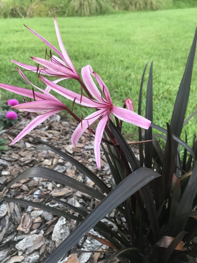 Plant leaves are dark almost black leaves one side and yard green opposite side. Flowers just bloomed today 8/10/18, zone 9b; do not believe of the crinum family. Plant bought distressed, no ID, two + years before this first bloom