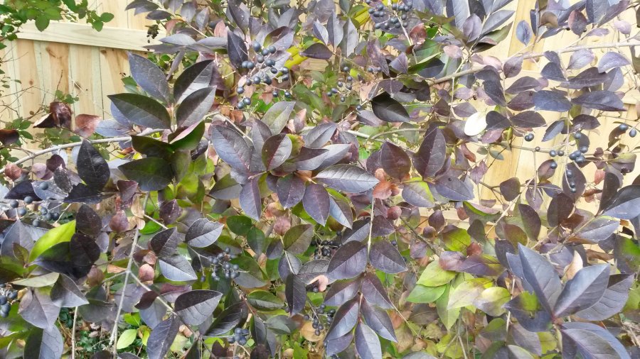 Pictures taken today Dec.13. in my back yard. Bush over 10 years old. Height about 7-8ft, width about 3ft. Leaves turned from green to purple with cold weather. Does not shed leaves until below 20 degrees F. White flowers in spring.