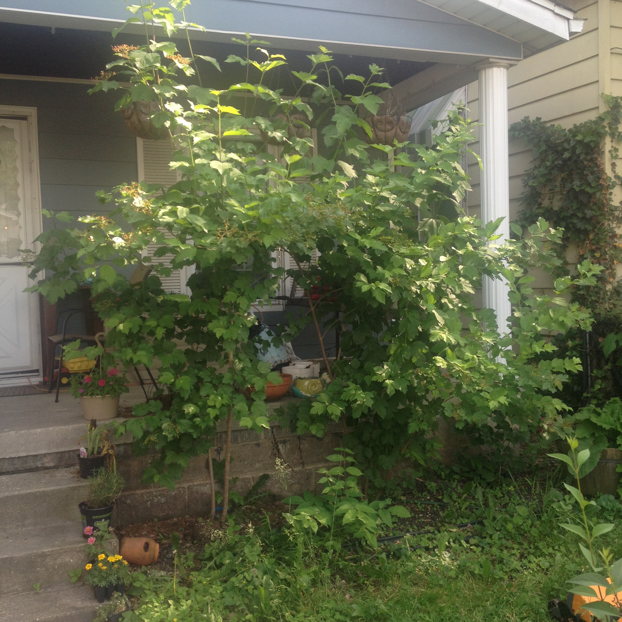 With the shape of fruit clusters, the opposite maple-leaves shape arrangement, and you mentioned “blackcurrant”. I am assuming the fruits are of black color. You might want to check out the maple-leaf species and cultivars with black fruits in the genus of Viburnum.