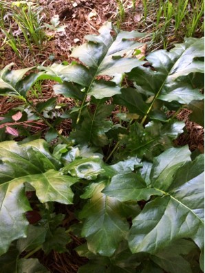 It appears to be growing at the base like a fern or hosta. Leaves are large on this plant ( 8-10″ from top lobe to the base of the lower leaf) A little shinny but not high gloss like holly and a softer leaf, not stiff like a holly. My guess was something native that is not a nursery plant. Dense shade part of the day and dappled light
