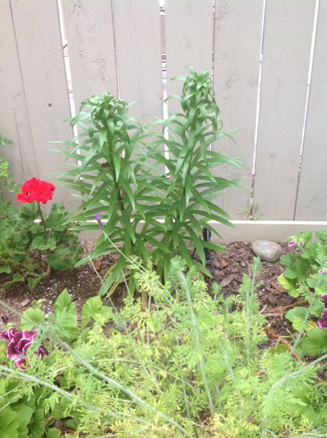 These two plants first appeared in my back yard in the fall as tiny twin green things. I had not planted them. They are now two feet tall and have new growth coming. I see nothing that looks like flower buds. They are beginning to lean over from height I assume.