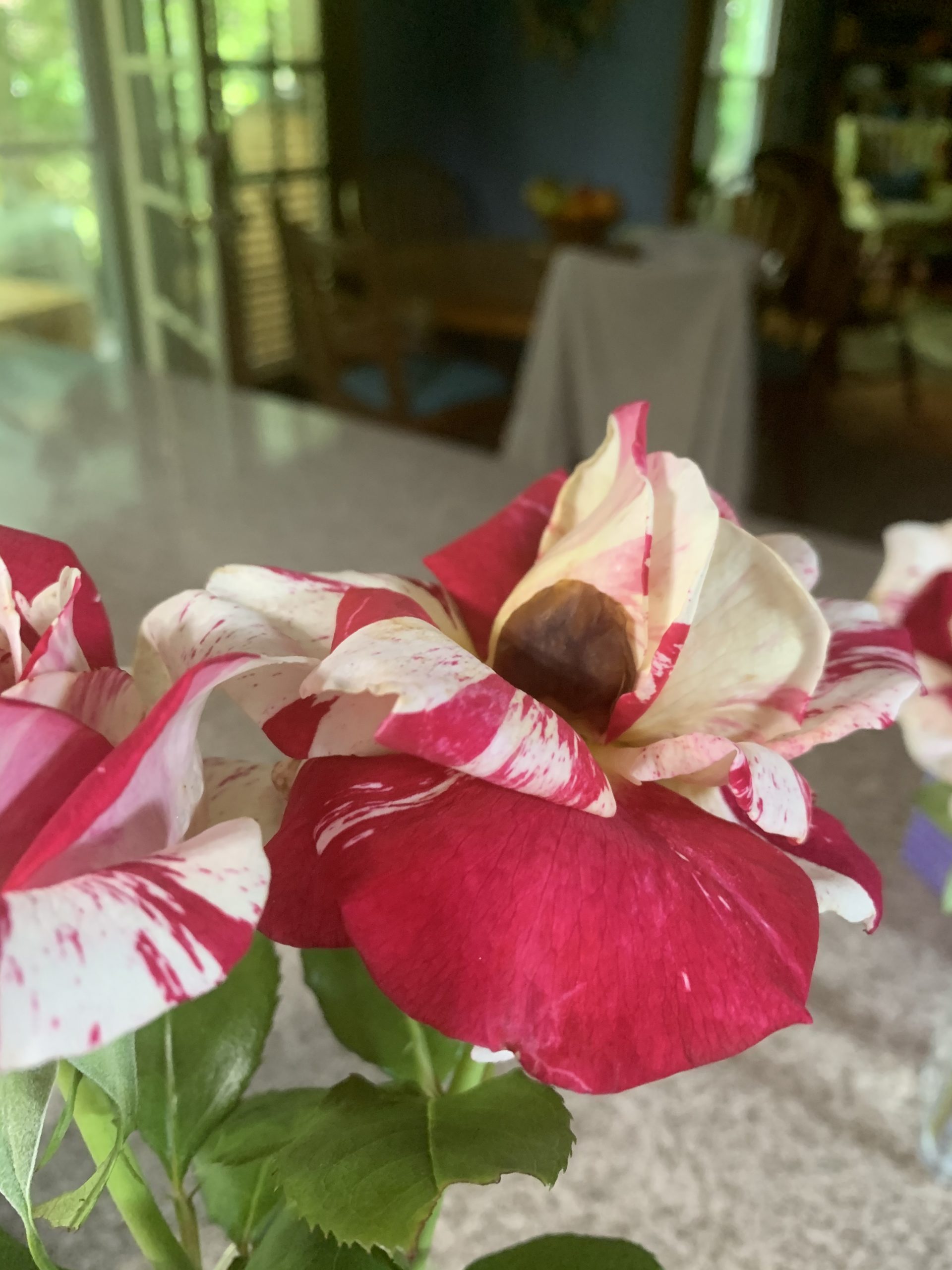 I previously sent a picture of a rose from the same bush. Here is a brown spot in the interior of the flower. Is it a fungus of some kind? How can I fix this??