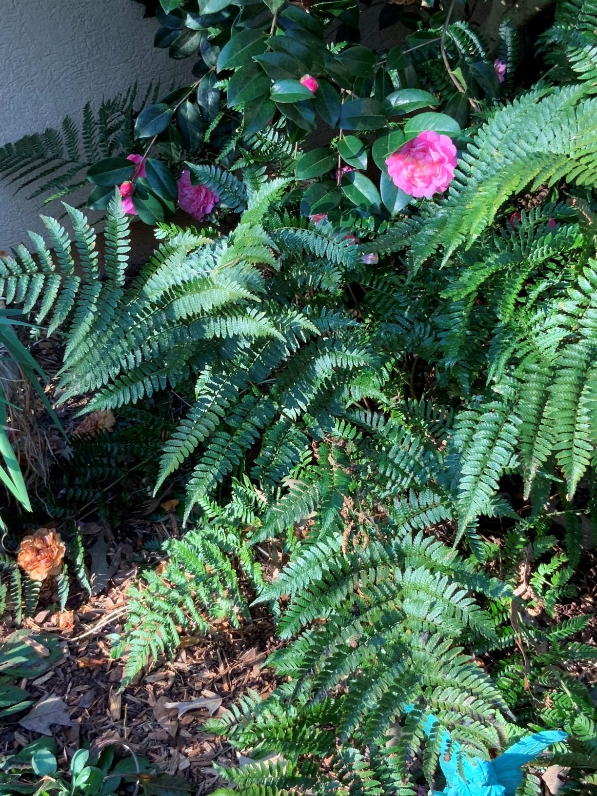 This is a very leathery fern, and it seems to be taking over this flower bed. I searched on the internet for info that might identify and found something called brackens. Is that what this looks like? It’s evergreen, some fronds turn bronze in the fall and it’s about 3 feet tall.