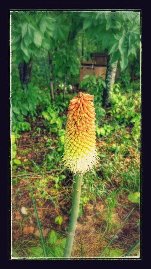 Red hot poker. http://www.walterreeves.com/gardening-q-and-a/red-hot-poker-identification/