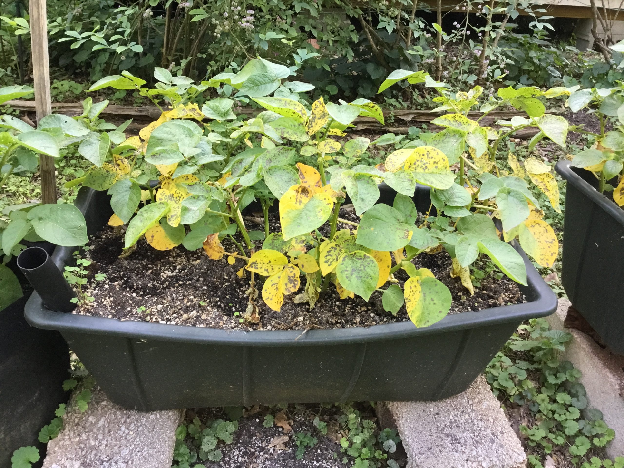 I have planted red and gold potatoes in earth boxes. I also have them in fabric bags. Those in the fabric bags are twice this size and healthy. Those in the earth boxes are turning yellow and have spots.