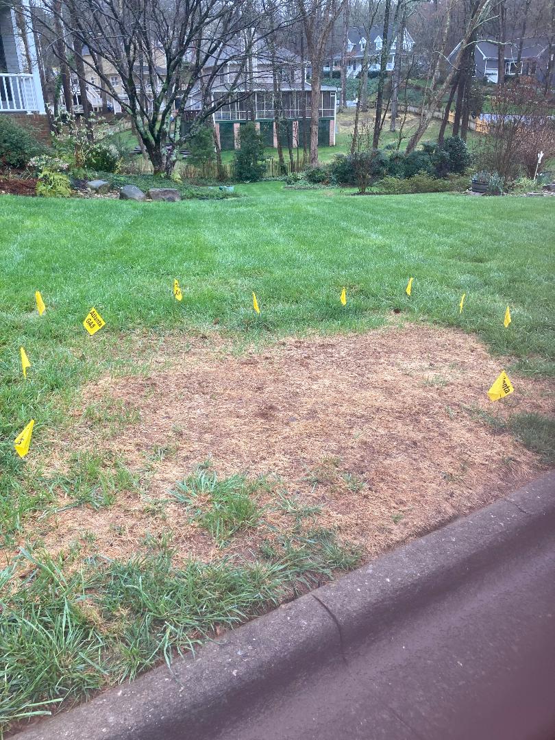 This apparently dead patch popped up in our fescue yard in January. It was a mystery to our yard service provider. In early March, we roughed up the dirt and applied seed we have used before that has worked well to seed bare spots. Today, there are no visible signs of germination. What should we do now? Is there a disease in the soil? Help!