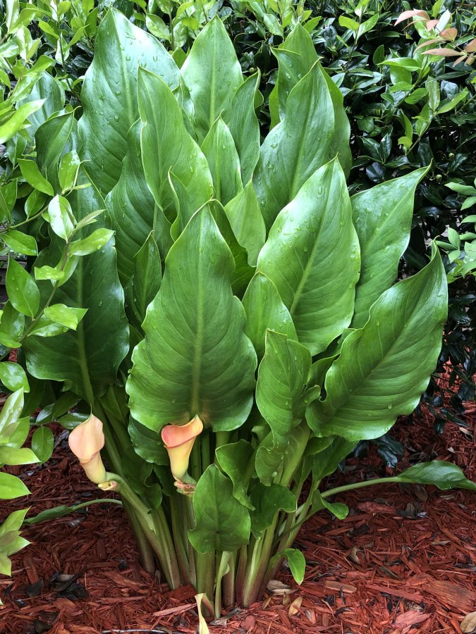 Last year this plant was just a bunch of tall green leafs, this year a few pink flowers have bloomed. The flowers are kind of shaped like calla lilies but are very different than the white calla lily I have that just has a couple of leaves and 1 flower.