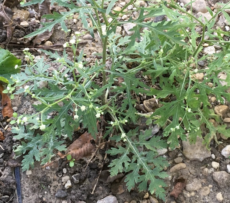 Lobed leafs, stalk, branches tiny white flower. This plant grows quickly in a clear lawn from seeds in neighboring yard where plant grows to massive flower. Easy to pull up. Left alone, it grows to about 18″ and proliferates to form a dense “tumbleweed” like hedge of tiny white flowers. A. What is it? B. any known pre or post emergent herbicides effective? Thank you.