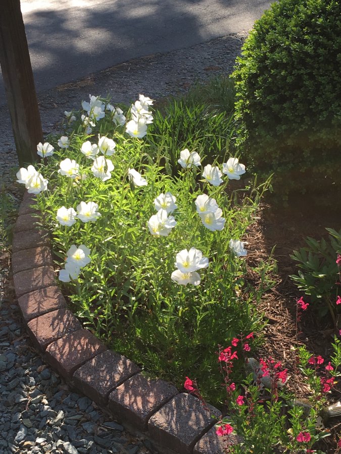 #1. Perennial . Several blossoms (4 petal) on 15-20 in stem. Flowers mid May-June, one flower on each stem at a time (flowers last 2-3 days). #2. Perennial. Profuse flowering May-Oct. woody. shrub? Herbeous smelling leaves when rubbed. 15-20 tall as is trimmed. Gets very leggy if not trimmed early spring.