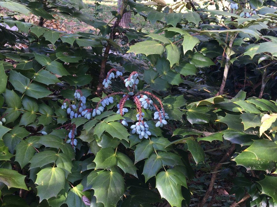 It has a commmon name of Oregon grape (from the Pacific Northwest) and is an aggressive invader. Planted by many as an ornamental, birds spread the seeds widely, and the plants tend to take over a forest understory.