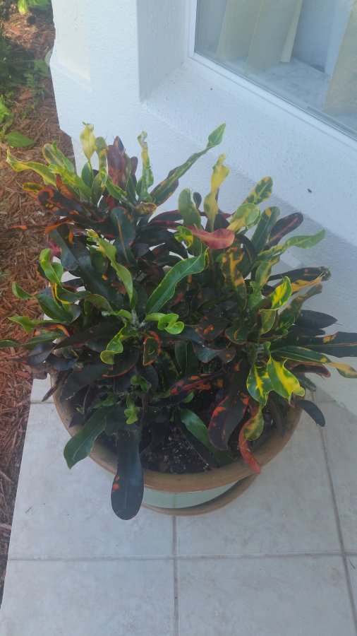 Looks like ‘Mammy’ a form of Croton plant (Codiaeum variegatum). Best wishes! http://davesgarden.com/guides/pf/go/177559/